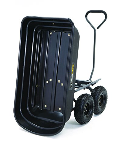 The newly-designed Gorilla Carts 600-lb. Capacity Poly Garden Dump Cart has an innovative, updated frame design that makes it quick and easy to assemble and put this cart to work. The cart features the patented quick-release dumping system, which allows the cart to be loaded and unloaded with ease, and the balanced 4-wheel design makes it a simple-to-use alternative to a wheelbarrow. The new frame design allows for easy assembly, while improving maneuverability and rigidity, increasing ground clearance, and giving the cart a tight turning radius. The durable poly bed is maintenance-free and easy to clean, and the 10 in. pneumatic tires are designed to handle any terrain whether you’re hauling heavy dirt, mulch, gravel, or plants. With a 600 lb. hauling capacity and padded dipped-grip handle, this cart is perfect for the casual gardener or the lawn professional. The bed dimensions measure 36-inches by 20-inches, and the cart has an overall height of 19.5-inches and weighs 32-pounds. Gorilla Carts full line of products meets the needs of the light-duty homeowner as well as the commercial-duty professional user by offering a wide variety of carts in different sizes and weight capacities. The Gorilla Carts GOR4PS Poly Garden Dump Cart comes with a 1-year limited warranty.